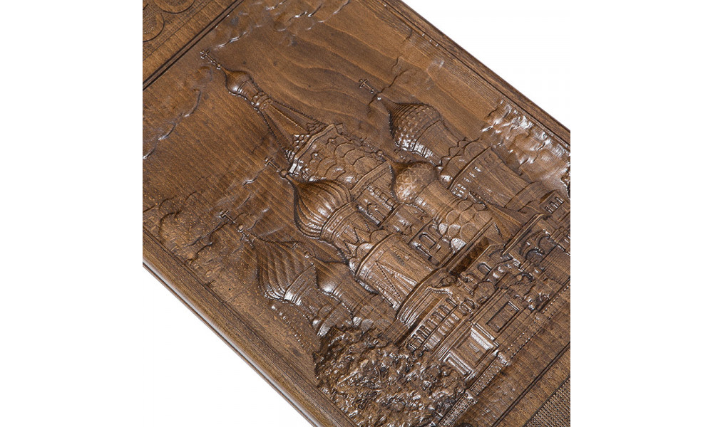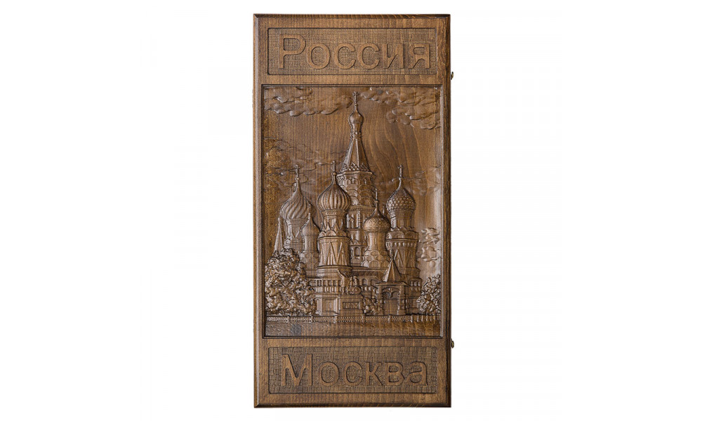Лицевая поверхность представляет собой изображение московского собора. Это полностью ручная работа, выполненная с максимальной скрупулезностью, поэтому и детализация настолько высокая. Текстура дерева специально не шлифовалась и смотрится здесь идеально. На обратной стороне имеется поле для игры в шашки, которое позволит расслабиться после напряженных партий в нарды.